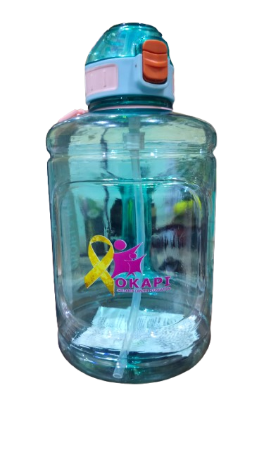 This is a clear, reusable water bottle with a teal-colored screw-top lid. The bottle has the OKAPI logo and ribbon symbol printed on the side. The bottle appears to be made of durable plastic material and is designed for sports or active use, with features like the screw-top lid for easy drinking. This type of water bottle is commonly used to stay hydrated during physical activities or when on the go.
